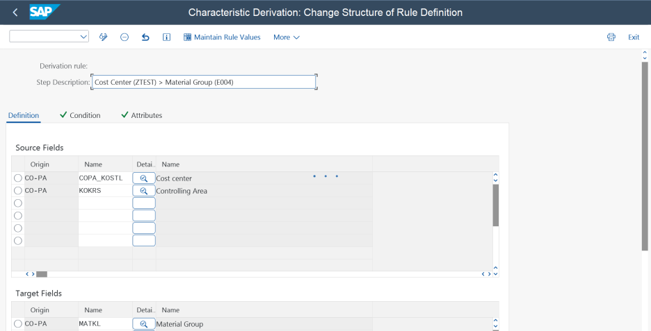 KEDR (트랜잭션) 을 의미하는 것으로, 사전에 정의한 Source 칼럼 (코스트센터) 의 값을 만족할 경우 Target 칼럼 (자재 그룹) 을 추출하도록 설정한다.