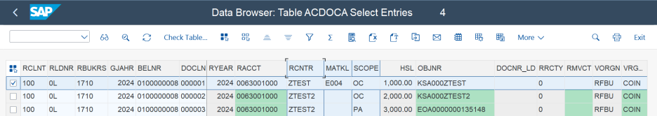 전표의 수익성 세그먼트의 코스트센터 칼럼에 직접 ZTEST2 코스트센터를 입력한 경우이다.