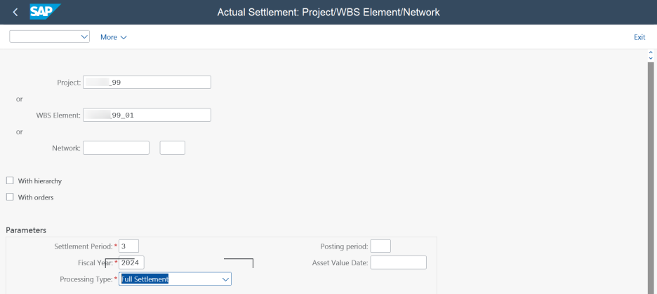 CJ88 (트랜잭션) 에서 Processing Type 을 Full Settlement 로 변경하면, 동일월에도 건설중인자산 대체와 본자산 대체를 연이어 실행할 수 있다.