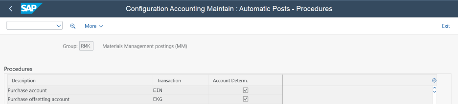 자동계정 지정을 목적으로 OBYC (트랜잭션) 에서 아래 거래키에 구매 입고/송장에 대한 각 차변/대변 계정을 설정할 수 있다.