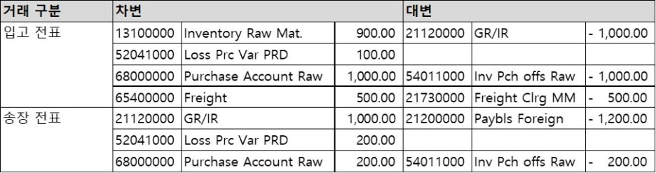 입고 전표 : GRIR 금액 기준으로 구매 계정 인식, Freight 금액은 가격 차이 계정 인식