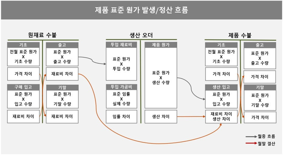 표준원가를 사용하는 제품을 생산하기 위해 투입된 원재료/가공비를 감안하여 월중 흐름 및 월말 결산 흐름에 대한 정보이다.