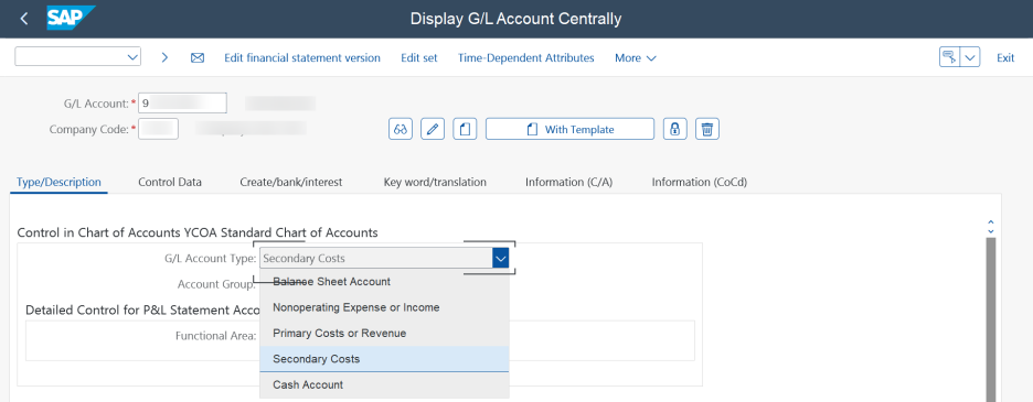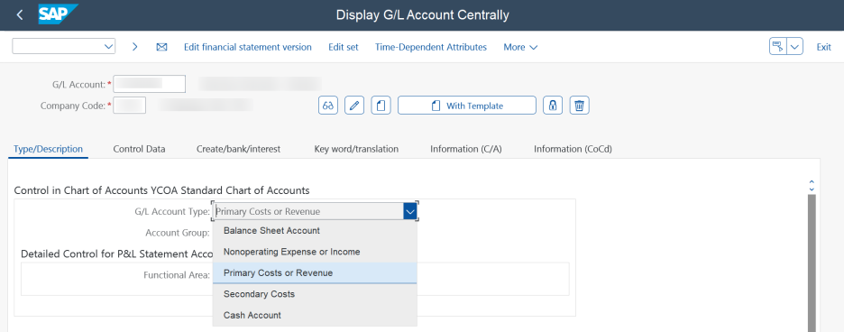 아래는 매출 계정의 예시인데, G/L Account Type 이 Primary Costs or Revenue 로 지정되어 있다.