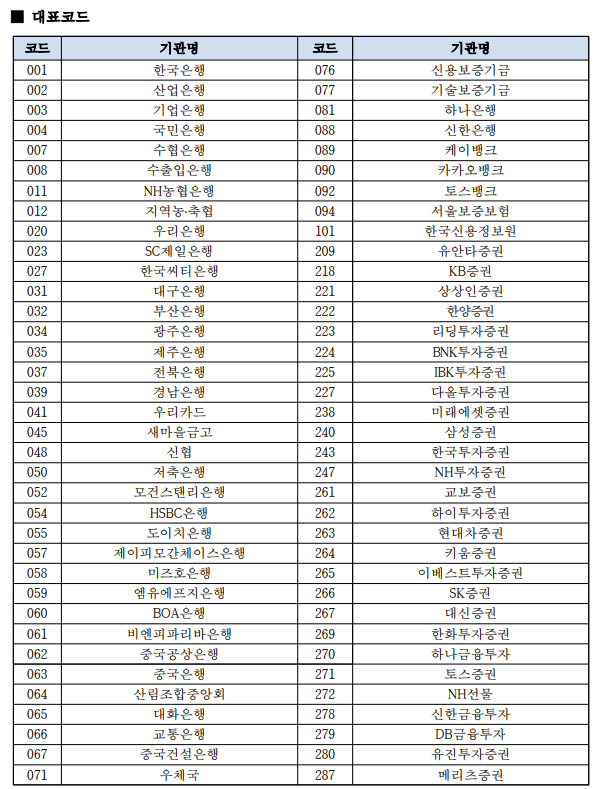 상세 내용을 살펴보면, 금융기관 별 대표 코드가 숫자 3자리로 구성된 것을 알 수 있다.