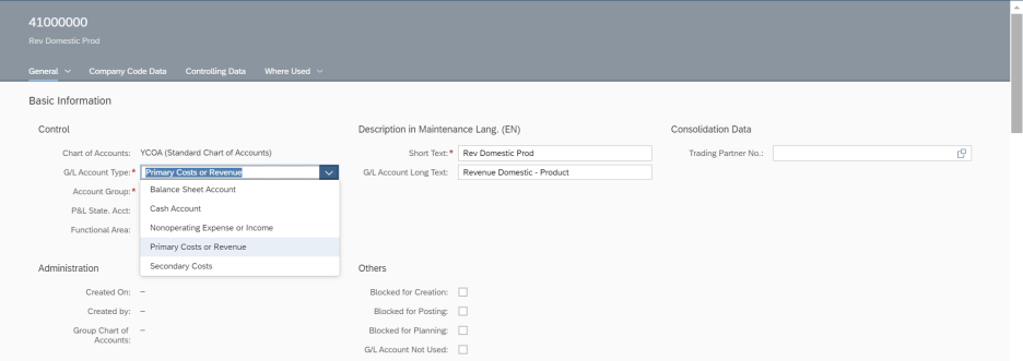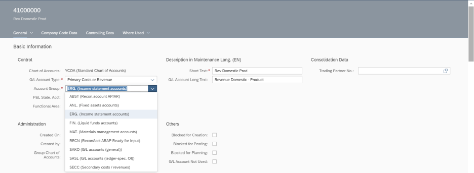 G/L Account 마스터에서 조직 (회사코드/관리회계 영역) 종속성 없는 계정 고유의 General 정보 관리